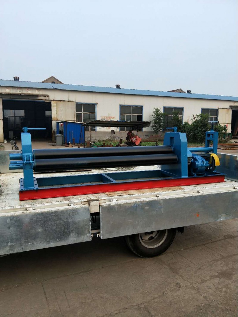 半自動卷板機(jī)結(jié)構(gòu)形式為三輥對稱式。上輥在兩下輥中間對稱位置作垂直升降運(yùn)動,通過絲杠實(shí)現(xiàn)上輥的升降,便使所卷制的材料變形,該卷板機(jī)是用于金屬板材型材彎曲、變型的一種通用設(shè)備,它借助于專用工具或其它設(shè)備來完成板材端面的預(yù)彎,可以卷制圓形、弧形工件,在石油、化工、鍋爐、水電、造船、工業(yè)設(shè)備安裝以及機(jī)械制造行業(yè)中有著廣泛的應(yīng)用。該機(jī)器采用倒順開關(guān)(已安裝在卷板機(jī)上)來實(shí)現(xiàn)卷板的正、反轉(zhuǎn),檢查機(jī)器無誤后,調(diào)節(jié)絲杠讓上輥壓至板材表面,把倒順開關(guān)打到“倒”“順”視現(xiàn)場板材的放入端而定讓電動機(jī)正轉(zhuǎn)還是把反轉(zhuǎn),卷制一邊后,手動調(diào)節(jié)絲杠讓上輥壓緊板材在“倒”“順”卷制,如此循環(huán)直至達(dá)至要求為止。