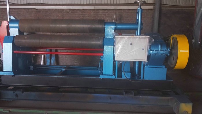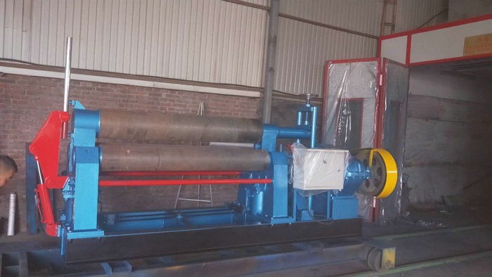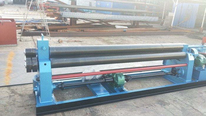 液壓下拉式卷板機主要特點:該機上輥可以垂直升降,垂直升降的液壓傳動,通過液壓缸內的液壓油作用活塞桿而獲得;下輥作旋轉驅動,通過減速機輸出齒輪嚙合,為卷板提供扭矩,下輥下部有托輥,并可調節。上輥呈鼓形狀,提高制品的直線度,適用于超長規格各種截面形狀罐。